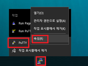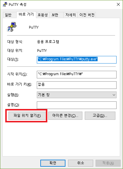 1. 뿌띠 PuTTY 아이콘을 우클릭해서 속성창을 열자