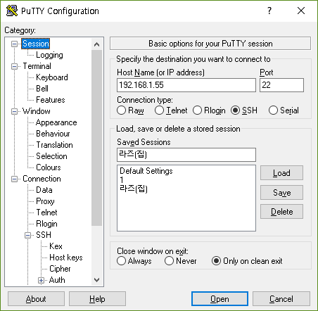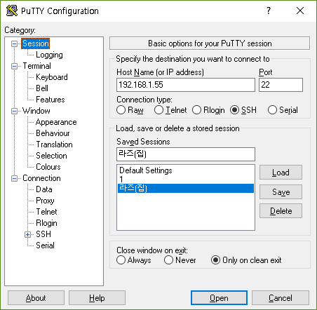 7. 뿌띠 PyTTY 창에서 현재 접속에 사용되는 세션을 선택하자