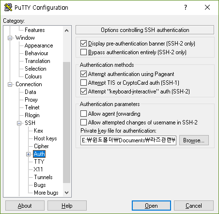 9. Connection 카테고리에서 SSH의 Auth를 선택한 후 제일 아래에 있는