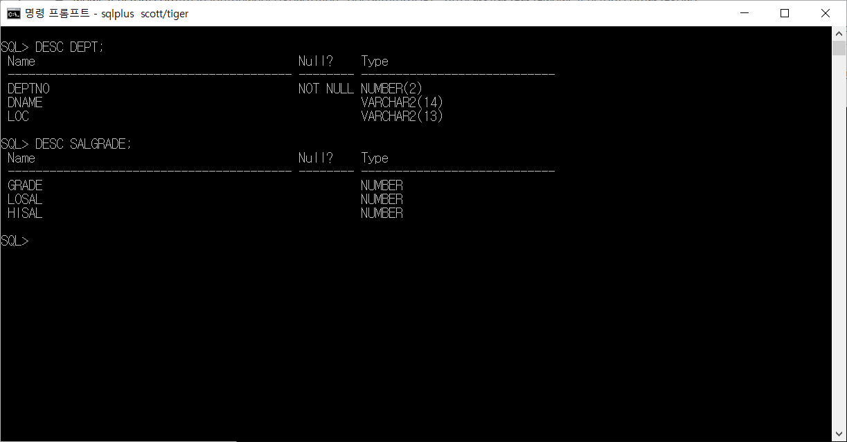 아래는 scott 계정에서 dept 테이블 양식 정보를 확인해 보았습니다. 컬럼(열)의 이름/Null 허용 유무/타입을 확인 가능합니다.