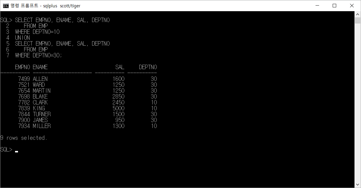 별도의 쿼리문 사이를 UNION 키워드를 사용하여 묶을 수 있습니다.
