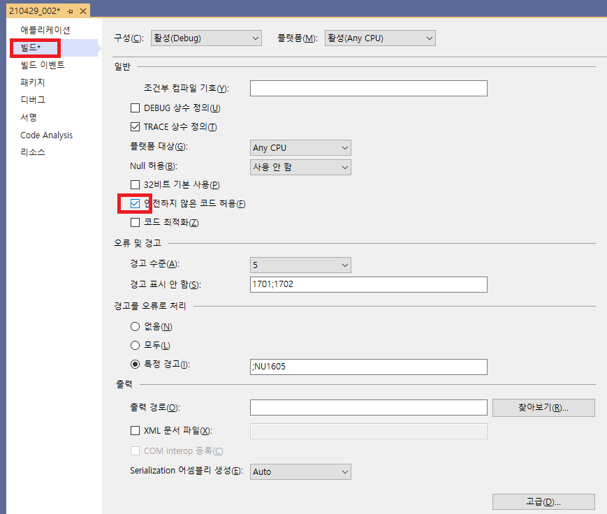 그 다음 프로젝트 옵션의 빌드 옵션에서 unsafe 키워드 사용을 허용해야 합니다.