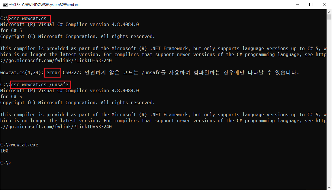 커맨드 창에서 직접 컴파일할 경우 /unsafe 키워드를 넣어서 컴파일 해 주어야 합니다.