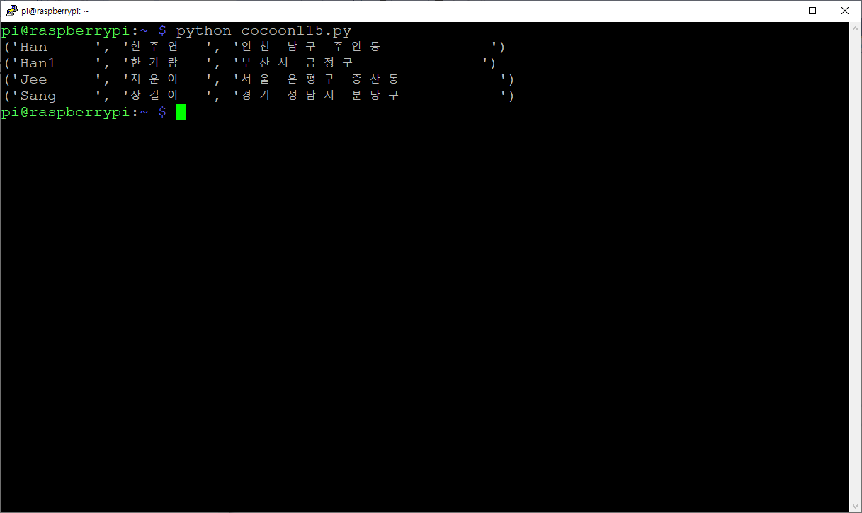 #queryInsert = "INSERT INTO memberTBL VALUES('Han1','한가람','부산시 금정구');"